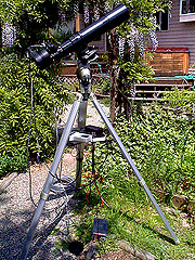 There was almost no drift, maybe 2-3 star diameters! This is amazing to me, since I couldn't get that good of a polar alignment with my Astro-Physics 600 GTO mount using the built-in polar alignment software. I am just amazed, no other word for it. There was slight drift, however, so I took two-minute exposures which gave me _perfectly_ round stars. A sample image of M13 shows this, as does an image of the Foxhead cluster Both images are stacks of four or more individual images, each of which had perfectly round stars. This indicates good guiding consistency. Out of the 11 images I took of these two objects, only one had to be tossed due to star trails. The other interesting thing about these images is that they were taken through fairly heavy high clouds with a 3/4 moon high in the sky; CCD can really handle sky glow! We could see Vega, but not any of the stars in the constellation Lyra or Hercules. Extended objects like M27 were harder to image successfully over the sky glow, but I am going to stack those images and see what I managed to get. After about an hour of slewing and tracking, I noticed that star trails started to increase, and this verifies what I suspected from the first night out: this mount is an energy hog. I was on a marine battery, and it was being drawn down pretty fast. I switched to a three-amp plug-in power supply, and the star trails went away again. This is the only caution I could find about the mount -- make sure you have plenty of power for it.Either charge your battery up really well so it is delivering 13 volts or more, or use a hefty 12V power supply. I was also successful with a 2-amp power supply, but I feel that the results were a bit more reliable with the 3-amp. I did try to tweak the polar alignment this time, just to see if the mount was capable of handling minor adjustments, and I was able to fine-tune the alignment better than I would have expected. The conventional wisdom has been that you need the Losmandy G-11 mount to do imaging of any quality. There have been a number of folks doing good work on lighter mounts, and it _definitely_ helps to choose a scope of a relatively short focal length (say under 800mm), or to use a focal reducer to get under that number. You will still lose an image every now and then to star movement, which I believe is due to periodic error -- about one image in ten seems to get a little streaky, and has to be discarded. Training the built-in PEC of the SkySensor will solve that problem, but losing 1 image out of 10 is not bad at all if you elect to use the GP-DX without the SkySensor. I would definitely recommend this mount to the budding astro imager as a competent "budget" mount for CCD imaging. It costs $999 for the mount alone, and the SkySensor 2000 PC adds another $1000. |