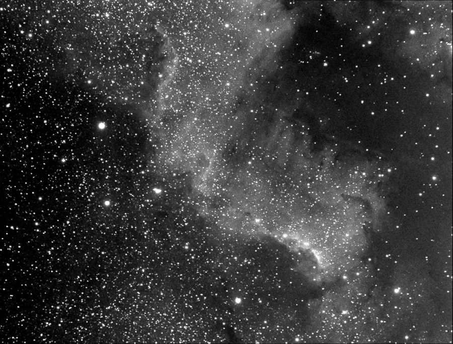 The image at right, a close-up of a portion of the Pelican Nebula, was taken with the same setup as the guided image (Traveler, ST-8E). It was taken through high clouds and haze. The image is a sum of 12 90-second images. Images combined, and digital development applied, in Maxim/DL. Contrast and levels tweaked in Photoshop 5.5. See my New Images page for additional images taken with this mount.
