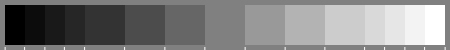 The image at right shows various shades of gray, ranging from pure black to pure white. There are small tick marks at the bottom, showing the point where each shade begins and ends. Adjust your monitor's brightness and contrast controls until you can see every shade of gray between the black and white extremes. |