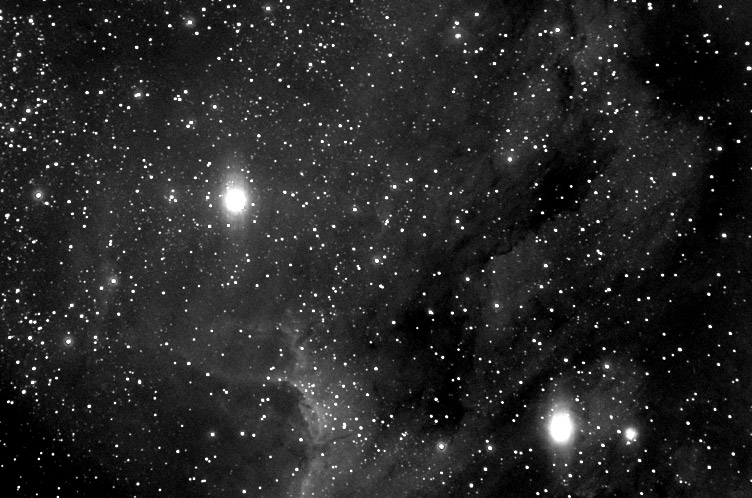 The image at right, a close-up of a portion of the Pelican Nebula, was taken with the same setup as the guided image (Traveler, ST-8E). It was taken through high clouds and haze. The image is a sum of 12 90-second images. Images combined, and digital development applied, in Maxim/DL. Contrast and levels tweaked in Photoshop 5.5. See my New Images page for additional images taken with this mount.
