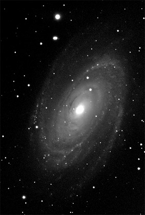 M81 M81 has very faint arms and a bright core, so image processing is used to balance the visibility of both features. I used Maxim/DL's Digital Development to provide this clear view of the full range of M81's feautres. Image Copyright 2000 by Ron Wodaski |